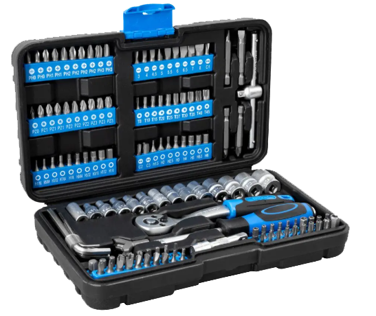 130-teiliges Werkzeugset beinhaltet ein umfassendes Bit-Sortiment inklusive Bit-Schraubendreher, Ratsche, Verlängerung, T-Gleitgriff, ein praktischer Hakenschrauber, sowie 4 Langbits und 13 passenden Steckschlüsseleinsätzen